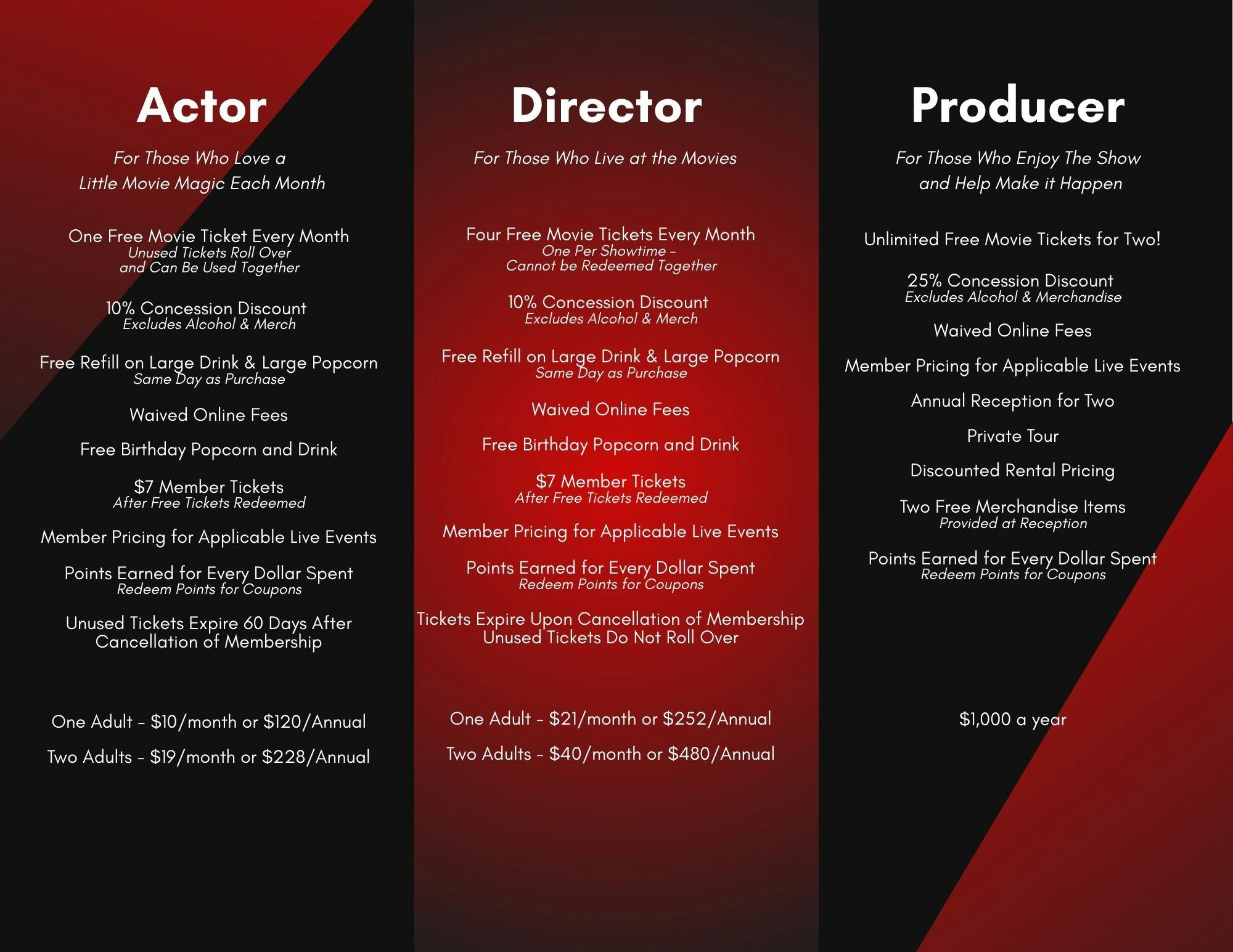 The Producer membership for $1,000 a year, you will receive unlimited seating for two people for movies, a 25% concession discount, and waived online fees!
